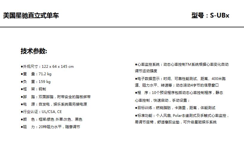 核心特性 ●更易使用和更加安全的踏板綁帶 ●賽車扶手設(shè)計,舒適的肘部支撐設(shè)計 ●易調(diào)節(jié)座椅設(shè)置,橡膠坐墊更加舒適 ●動態(tài)心率監(jiān)控系統(tǒng)TM:根據(jù)用戶的心率自動調(diào)節(jié)運動 ●受廣大用戶喜愛的可調(diào)節(jié)式風(fēng)扇 ●莫氏踏板系統(tǒng)-尺寸加大40%/強度增加4倍 ●莫氏中軸-尺寸加大30%/強度增加4倍 ●400米跑道設(shè)計,使運動更具趣味性 ●更快速便捷的維護操作 ●友好的用戶界面和控制面板,動態(tài)滾動4字節(jié)的信息窗口顯示。10個預(yù)設(shè)程序,Polar?遙測式和手觸式心率監(jiān)測系統(tǒng)及多用途個人物品存放架 ●自發(fā)電系統(tǒng),無需接駁電源 ●內(nèi)置預(yù)留線,可升級星馳娛樂系統(tǒng) ●寶馬汽車設(shè)計師美國DesignWorks傾力外觀設(shè)計