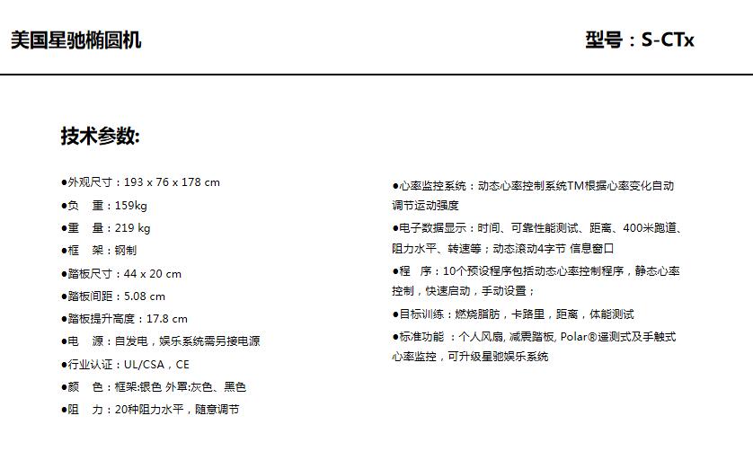 核心特性 ●全身有氧訓(xùn)練,多把位防滑把手設(shè)計 ●零沖擊橢圓式運動,前行逆轉(zhuǎn)動作順暢 ●星馳獨有的踏板吸震功能,讓運動過程更舒適 ●便捷啟動功能,自發(fā)電系統(tǒng),無需接駁電源 ●前置式驅(qū)動和低踏板設(shè)計,方便用戶從各個方位進入和使用機器,比同類產(chǎn)品更安全,減少占地面積 ●受廣大用戶喜愛的可調(diào)節(jié)式風(fēng)扇 ●符合生物力學(xué)最優(yōu)化Q因數(shù)的窄踏板設(shè)計 ●400米跑道設(shè)計,使運動更具趣味性 ●更快速便捷的維護操作 ●友好的用戶界面和控制面板,動態(tài)滾動4字節(jié)的信息窗口顯示。10個預(yù)設(shè)程序,Polar ?遙測式和手觸式心率監(jiān)測系統(tǒng)及多用途個人物品存放架 ●內(nèi)置預(yù)留線,可升級星馳娛樂系統(tǒng) ●線條簡潔、框架牢固、安全可靠的設(shè)計 ●寶馬汽車設(shè)計師美國DesignWorks傾力外觀設(shè)計